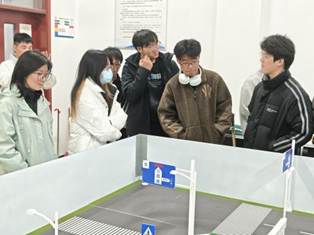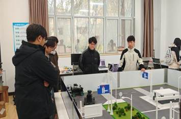 实验室中央的智慧交通车路协同实训平台成为焦点。随着学长启动程序,智能小车迅速响应,在模拟路况中精准识别红绿灯,平稳完成启停、转向等动作,引得同学们前倾身体、举机记录,围绕技术原理踊跃提问。