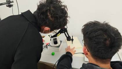 一旁的智能机械臂同样吸睛,电脑程序控制下,它灵活完成抓取、平移、精准放置等动作,更换末端执行器后更能握笔书写工整字迹,一连串硬核操作让同学们驻足称奇,真切感受智能技术落地的广阔前景。